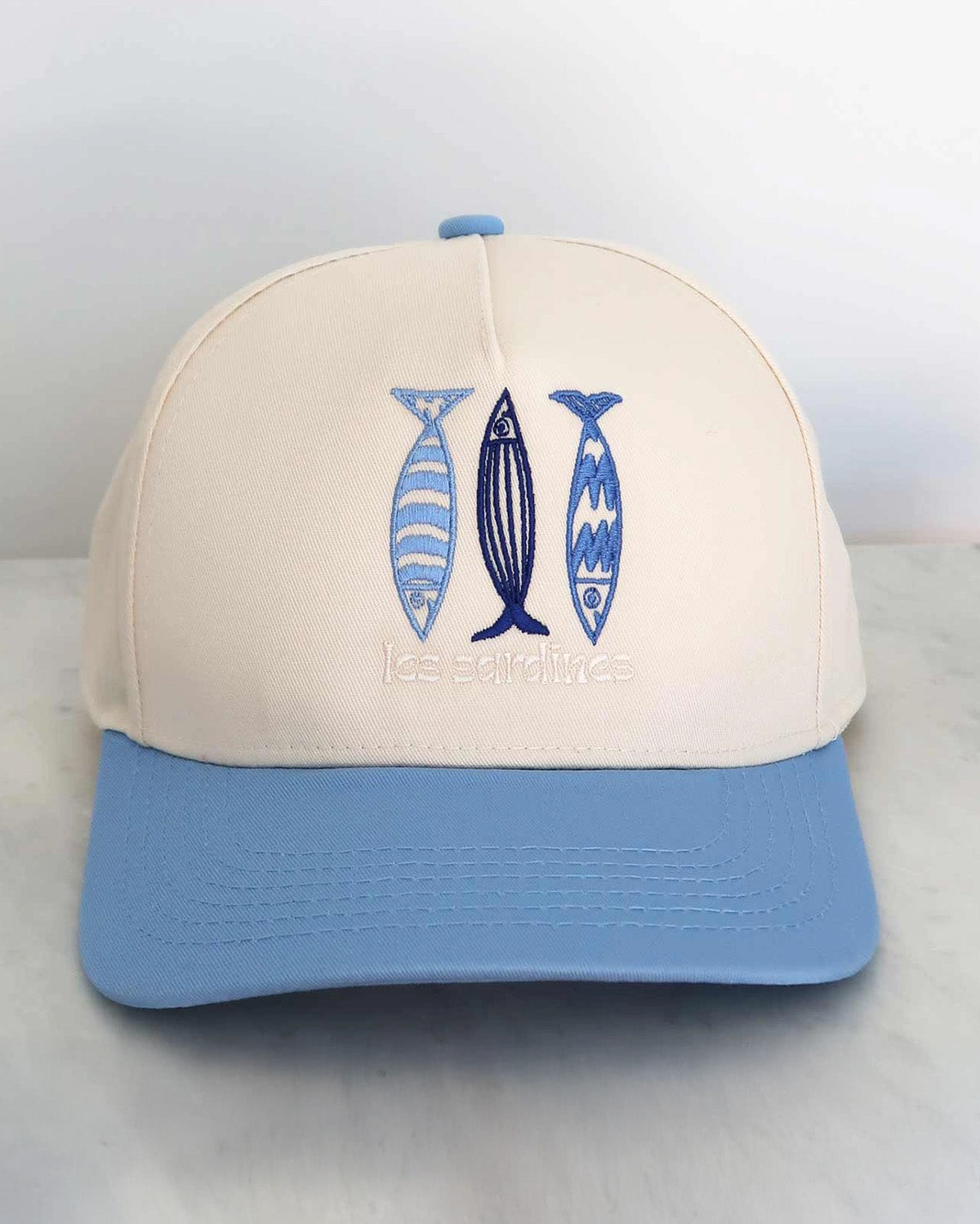 Three illustrated fish swim across the front, with les sardines stitched below, an understated nod to French seaside culture and long lunches by the water. Equal parts charming and wearable, it’s the kind of hat that feels just as right in a beach town as it does on a city sidewalk.