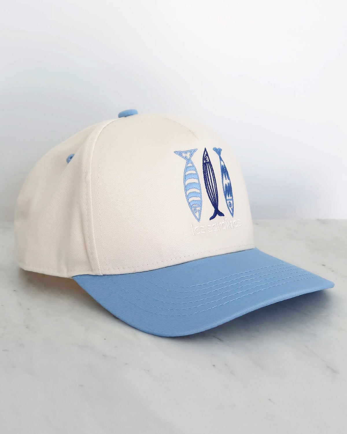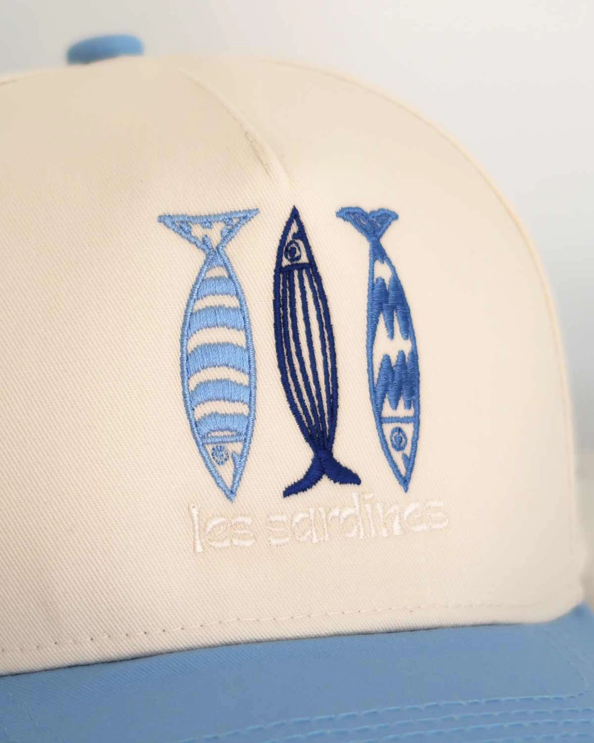 Channel European summer energy with the Les Sardines Embroidered Fish Hat, a playful yet polished take on classic coastal style. This 5-panel cap features a soft natural crown paired with a crisp blue brim, finished with detailed embroidery in three shades of blue.